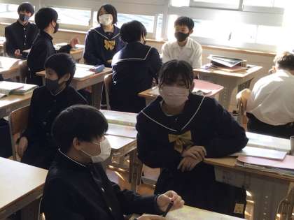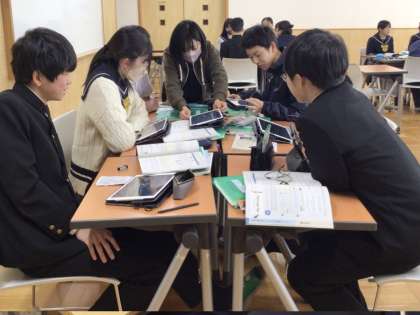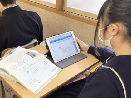 20日(水)、1年生の英語の授業では、疑問詞を活用した対話の学習を行っていました。1分間の会話を続けるにはどうしたら良いかをペアで考え、クラス全体でも話し合っていました。2年生の国語の授業では、漢詩の学習を行っていました。教科書に取り上げられた複数の漢詩の中から気に入ったものを選んで、自分なりに特徴などを調べてタブレットにまとめていました。3年生の音楽の授業では、表現の学習を行っていました。学習用タブレットの音楽用アプリを使い、基本となる曲の楽譜に自分なりの表現を加えて、各自がオリジナルの曲を作っていました。班で互いの作品を聴き合い感想を話し合っていました。このようなことが手軽にできることに驚きました。