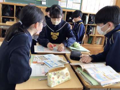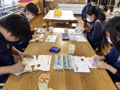 15日(月)、1年生の体育の授業では持久走を行っていました。試走に続き2回目の測定になります。冷たい風が吹く中、歯を食いしばり、腕をしっかり振って懸命に走る姿が見られました。ペアの生徒が記録用紙にタイムをメモしながら、一生懸命に応援している姿もとても良かったです。2年生の美術の授業では、ガラス素材に自分がデザインした部分への着色を行っていました。綿棒を使って細かく色をのせてきれいなグラデーションを表現していました。細かな作業のため、息を殺しながら作品を凝視していました。3年生の社会の授業では、国の社会保障や税に関する学習を行っていました。北ヨーロッパとアメリカの比較を行い、望ましい社会保障のあり方について、グループで議論していました。社会に出た時のことを想定しながら、具体的に話し合っている姿がとても頼もしく感じました。