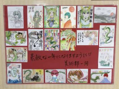 美術部の皆さんがハガキサイズのカードに、新年の挨拶を素敵なイラストともにまとめて、昇降口のところに掲示してくれました。どれも力作ばかりで、前を通る生徒の皆さんも足を止めてじっくり見ている姿が見られました。新年の気分を盛り上げてくれた美術部の皆さんに感謝したいと思います。