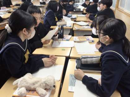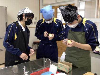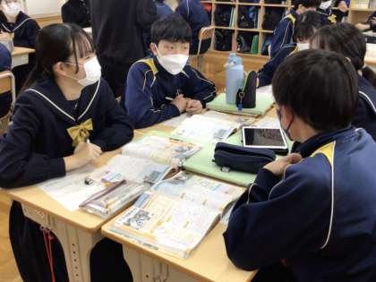 18日(木)、1年生の国語の授業では、随筆の学習を行っていました。前時までに各自が書き上げた随筆をグループで互いに読み合い、随筆の書き方や表現の工夫等について、評価し合っていました。表現力を高める良い機会になっていました。2年生の家庭の授業では、調理実習を行っていました。今回は鬼まんじゅうづくりに取り組み、先生の指示に従い、協力しながら手際よく取り組んでいました。3年生の社会の授業では、公害や環境問題についての学習を行っていました。各自で自分の考えや調べたことをまとめたのちに、グループや学級全体で意見交流をしていました。現代の課題を自分なりに考えることはとても大切なことだと感じました。