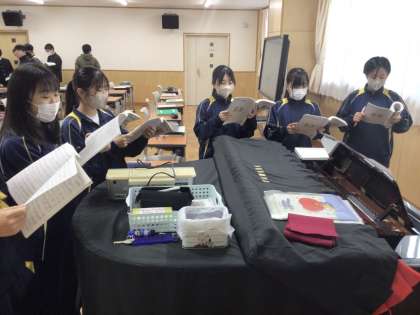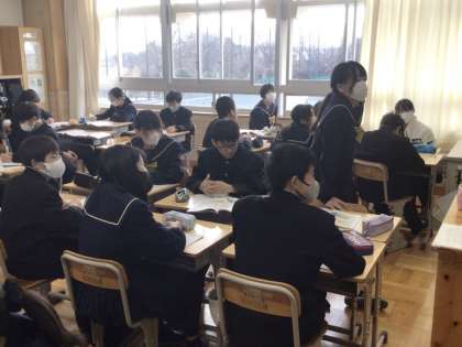 19日(金)、1年生の道徳の授業では、「公平と不公平」をテーマに学習していました。教科書に掲載された具体的な場面を見ながら、グループや学級全体で公平か不公平かを話し合っていました。自分の考えを発表し、仲間の意見を聞くことでさらに考えを深めていました。また不公平な場面についてはどうすべきかについても話し合っていました。2年生の体育の授業では、持久走の学習を行っていました。2年生ではチームを組んで最終的には駅伝で競うことを目指して、グループで各自の持ち味を確認したり、練習メニューについて話し合ったりしていました。それぞれどんな作戦を練ってチーム力を高めていくのか楽しみです。3年生の音楽の授業では、合唱の学習を行っていました。いよいよ卒業に向けた合唱の練習が始まりました。楽譜を読み込み、歌詞を考えながら練習に取り組んでいました。