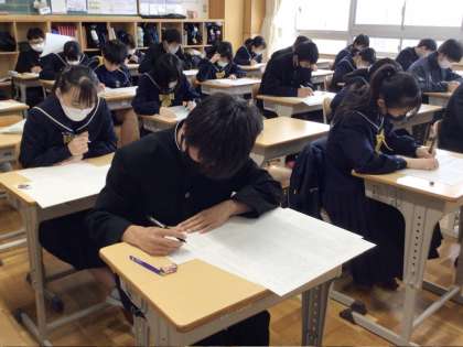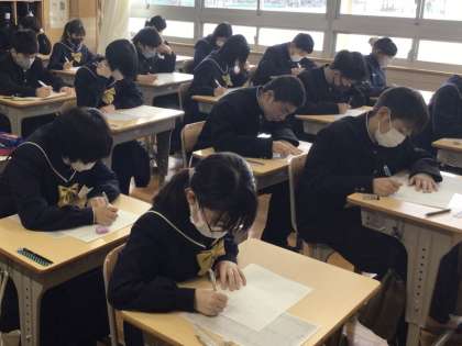 24日(水)、1年生、2年生ともに多くの教科の授業で、来週行われる学習診断テストやその後に行われる学年末テストに向けて、復習や対策問題に取り組んでいました。窓の外でしんしんと降る雪にマッチしてどの教室も集中してピンと張り詰めた空気が漂っていました。演習後に、教科担任の先生の解説を聞きながら、熱心にメモをとっている生徒もいて、生徒の皆さんの意欲を感じました。3年生は本日も私立高校や専修学校の入試のため、2時間で下校しました。多くの生徒は自主学習に取り組んでいましたが、今後の入試に向けて面接練習に励んでいる生徒もいました。面接も人生初の経験ですので、しっかりと練習に取り組んでいました。