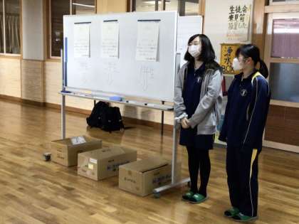今週は生徒会執行部の呼びかけで、ペットボトルキャップ回収の活動を展開しています。今回は学年対抗ということで、学年ごとに用意したダンボール箱にいくつ集まるか競うことで楽しみながら取り組む企画となっています。登校時に生徒会執行部のメンバーが立って呼びかけをしていました。袋いっぱいのキャップを持ってきて提供している生徒もいました。現在、2年生用の箱に大量のキャップが集まっています。1、3年生も頑張ってほしいと思います。