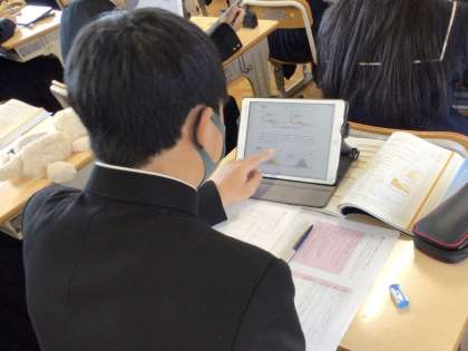 1年生の国語の授業では、文章表現の学習を行っていました。今回のテーマは案内文で、クラスの仲間に紹介したいイベント等の情報をもとに案内文を作っていました。まずは紹介したいイベント等の内容について学習用タブレットで調べて、案内文の項目を整理していました。2年生の体育の授業では、サッカーの学習を行っていました。男女に分かれてゲームに取り組んでいましたが、どちらも冷たい強風が吹く中でも元気にボールを追って走り回っていました。待機している生徒も熱心にリフティングの練習を行うなど、技量アップに努めていました。3年生の朝の時間には、生徒自身で合唱の練習に取り組んでいました。互いに声を掛け合いながら真剣に歌っており、卒業に向けた想いを感じました。