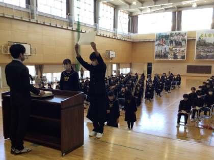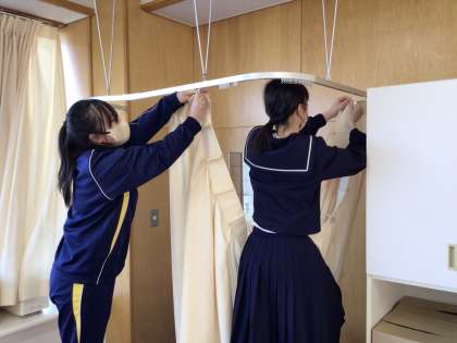 3月1日(金)、1年生の家庭の授業では衣服の学習を行っていました。洗濯の実習と、洗濯し乾いたカーテンを取り付ける作業を行っていました。取り付けでは慣れない高所の作業ということで、苦戦しながら取り組んでいました。当たり前に設置されているものも自分たちで扱えるようになるのはとても大切な学習です。2年生の家庭の授業では、消費者教育の一環として、すごろくゲームに取り組んでいました。大手金融企業が制作した本格的もので市販の人生ゲームに近いものです。社会に出てから起こるであろう様々な事象について、まずはゲームで擬似体験し、その後の授業で詳しく学んでいく予定です。3年生の卒業式練習では、一通り通して行っていました。スムーズに流れ、みんなの表情も真剣そのもの。練習の機会も後わずかですから、頑張ってほしいと思います。