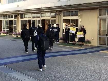 11日(月)朝、登校時に令和6年度の生徒会執行部に立候補する生徒の皆さんが呼びかけを行っていました。本日の午後が演説会と投票のため気合が入っていました。最後までしっかりとアピールできると良いと思いました。