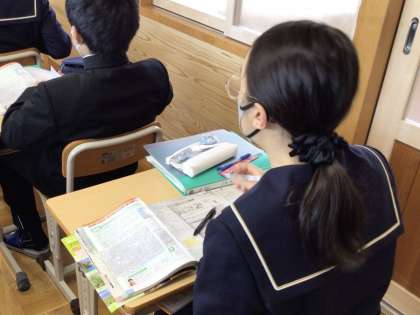 11日(月)、1年生の社会の授業では、1年間の復習を行っていました。みんなが苦労しそうな地図の縮尺の読み取り方について、例題で確認した後、演習に取り組んでいました。計算をしてもとめなければならないので、悩みながら取り組んでいました。地図を見ておおよその距離を掴むことはとても大切なことです。2年生の国語の授業では、作文の学習を行っていました。今回のテーマは意見文。身近な問題等を取り上げて、自分の考えを述べていきます。まずはワークシートに内容や主張したいこと等を整理していました。書くことに没頭している生徒もいれば、何を書こうかな、と悩んでいる生徒もいました。
