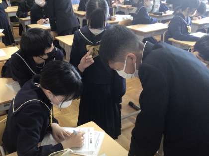 9日(火)、1年生は学年集会を行っていました。学年の先生たちの自己紹介や交通安全指導が行われ、最後に学年主任の先生から生徒の皆さんにこれからの学校生活で大切にしてほしいことを歌と共に伝えていました。生徒の皆さんはとても集中して参加することができて感心しました。2、3年生は学級の時間に、学級組織や給食、清掃等、生活の基本となることを話し合って決めていました。2年生のある学級では、同じグループの仲間と意見を交わしながら分担を決めていました。3年生のある学級では、清掃のやり方マニュアル動画を視聴する等して、清掃の進め方を改めて確認していました。