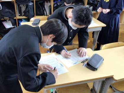 11日(木)、1年生の学級活動では教科担任の先生とのパイプ役となる大切な教科委員や学級の大事な道標となる級訓を決めたり、クラスの仲間を知る活動を行ったりしていました。2年生はかくし芸大会や学年集会を行い、学年の結束力を高める取組をしていました。3年生の学級活動では修学旅行や生活の基盤となる班活動に関する話し合いを行っていました。グループで話し合ったり、タブレットを活用して調べたりとそれぞれが工夫しながら協力して取り組んでいました。