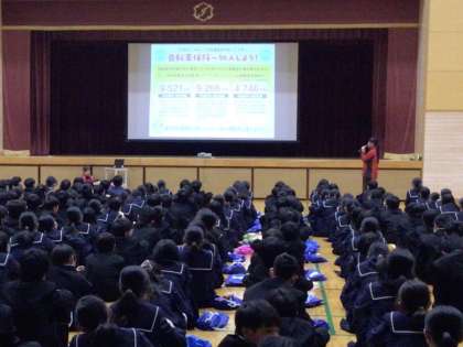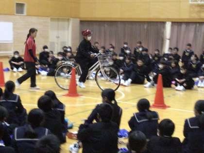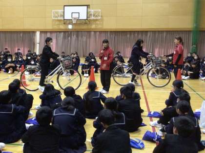 12日(金)午後、1年生が自転車安全講習会を行いました。豊田市交通安全センターの方に来ていただき、映像を使いながら説明してくださったり、自転車を使って実演してくださったりとていねいに教えてもらいました。代表生徒が危険な乗り方を体験してくれましたので、様々なことに気をつけながら自転車に乗ることの大切さを学べました。これから登下校はもちろん帰宅後や休日も学人だことを生かして安全に乗れるようにしてほしいと思ます。
