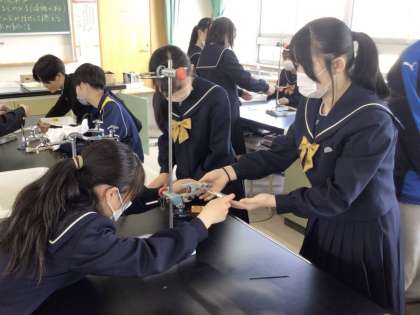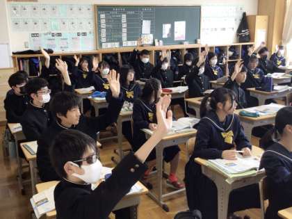 17日(水)、1年生の体育の授業では、体育祭の種目の一つである8の字跳びを行っていました。始めたばかりですので、回し手、跳ぶ人どちらもタイミングを合わせるのに苦労していました。これから各学級で練習を重ねて上達していってほしいと思います。2年生の理科の学習では、加熱による物質の変化の実験を行っていました。2年生になって初めての実験ということで、グループの仲間と対話をしながら作業を進めていました。3年生の社会の学習では、歴史で世界恐慌について学んでいました。ペアで話し合ったり、学級全体で分かったことを共有したりして大変意欲的に発言・発表に取り組んでいました。他のクラスでは世界恐慌について、先生から出された課題に対してタブレットや教科書を元に仲間と協力して解答を考えていました。
