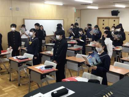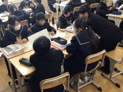 23日(火)、1年生の国語の授業では、詩の学習を行っていました。各自が詩を読んで気づいたことや感じたこと、想像したこと等をメモし、グループで共有していました。仲間の意見に身を乗り出して一生懸命に聞いたり、納得や感心しながら聞いたりして、考えや感じ方が深まっているようでした。2年生の英語の授業では、ALTとの対話を行っていました。テーマは日本とアメリカとの学校制度の違いについてで、ALTが英語で説明する解説をクラスみんなの協力で理解したり、想像したりしながら、楽しく日本とアメリカの違いを理解していました。3年生の音楽の授業では、歌唱の学習を行っていました。日本の歌「花」と題材にして、歌詞やリズム等の要素からどのような情景が表現されているのかを考え話し合い、このことを踏まえながら実際に歌っていました。授業を通して、より味わい深く感じながら歌うことができたと思います。