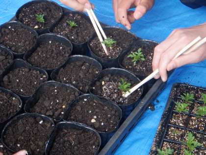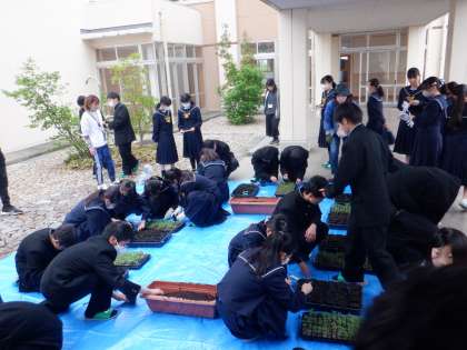 植替えには多くの生徒が集まってくれ、箸をつかって丁寧に優しくポットへ移していきました。今から美しく咲き誇るのが楽しみです。