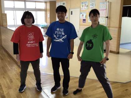 10日(金)の午前中に水龍祭で着用するTシャツが学校に届きました。早速3年生の先生たちが試しに着ていましたので撮影させてもらいました。色はクラスカラーで、胸のイラストは各学級で工夫して作っており、学級の団結力も高まることを期待しています。もちろん、従来のハチマキよりも遠くからクラスが確認しやすくなりましたので、競技の上でも、保護者の皆様の見やすさという点でもより良い形になるのではと考えています。それぞれのデザインを見比べるのも当日の楽しみの一つになりそうです。