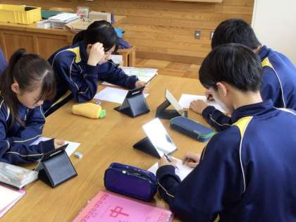 13日(月)、1年生の国語の授業では、物語文の読解の学習を行っていました。文章表現から登場人物の心情を読み取りながら、理解を深めていました。ある登場人物の心情の変化に焦点を当てて、自分の考えを仲間に伝えながら深めていました。2年生の数学の授業では、文字式の応用の学習を行っていました。様々な問題について、学んだ文字式を活用してどのように式を立てて考えればよいかをペアやグループ等で話し合いながら一生懸命に取り組んでいました。3年生の美術の授業では、デッサンの学習を行っていました。モチーフは自分の顔です。鏡を何度も見ながら熱心に鉛筆を動かしていました。集中力が素晴らしいです。