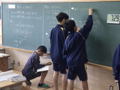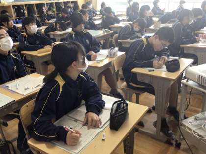 21日(火)、1年生の数学の授業では、文字式の学習を行っていました。加法の交換法則や結合法則を使って計算する方法を学び、問題演習に取り組んでいました。法則を活用することで、効率よく計算したり、考えやすくしたりできることを学んでいました。2年生の数学の授業では、文字式の利用の学習を行っていました。整数の計算に関する問題について、文字式を使って証明することを取り上げていて、ワークシートに考え方や計算の足跡を書き加えながら、考えを深めていました。3年生の家庭の授業では、幼児の特徴を学習していました。幼児の発達レベルを体感するために、利き手ではない方の手に軍手を着用し、その手に鉛筆を持って簡単な色塗りをする作業を行っていました。作業後に多くの生徒が思わず「むず!」と声を挙げていたのが印象的でした。