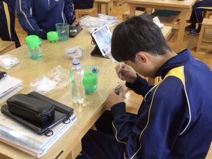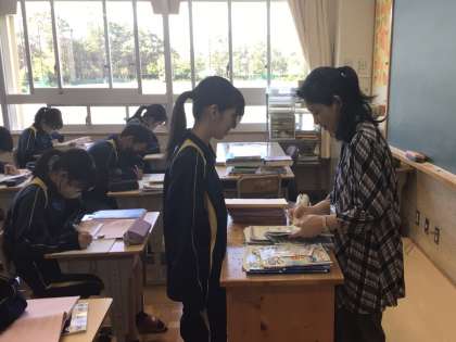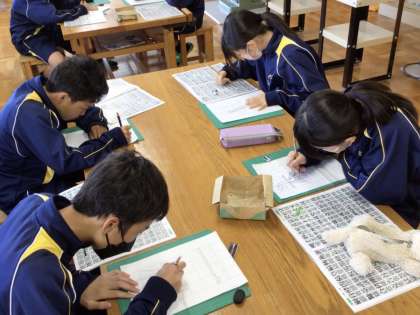 29日(水)、1年生の美術の授業では、レタリングの学習を行っていました。書体ごとの描き方の特徴や文字の配置の仕方などを学び、それぞれが実際に漢字一字を描いていました。時々挙手をして先生に確認をしてもらったり、アドバイスをしてもらったりして少しずつ仕上げていました。2年生の技術の授業では、栽培の学習を行っていました。一人一鉢用意して、スイートバジルの水耕栽培に取り組んでいます。水換えや液肥作り、液肥の注入等先生の指示に従って丁寧に取り組んでいました。それぞれの成長具合の違いに一喜一憂しながら作業をしていました。無事に育つといいです。3年生の英語の授業ではテストに向けた復習や演習を行っていました。明日から始まることから、大変集中して取り組んでいました。先生に学習の取り組み具合を見てもらうなど、それぞれにできることを熱心に取り組んでいる様子でした。
