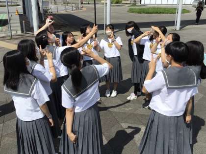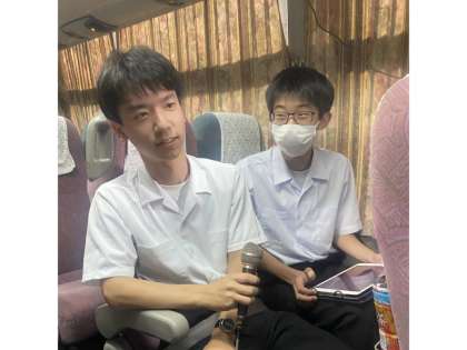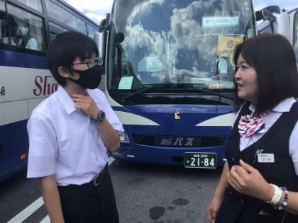 SAでは記念撮影を楽しむ姿も見られました。また、今回の目的の一つである総合的な学習の時間の一環として、バスガイドさんにインタビューをしている生徒もいました。再びバスでの移動が始まり、各バスではカラオケや映画鑑賞、音楽鑑賞をしながら楽しく過ごしています。