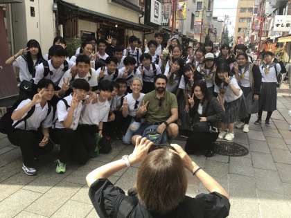 6、7組が浅草に到着しました。外国人観光客の方と会話をするというミッションをきっかけにイタリアの方と仲良くなったそうです。