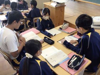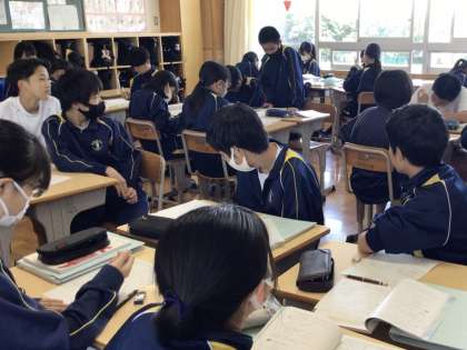 10日(月)、1年生の国語の授業では、詩の学習を行っていました。詩の読み取りを行った後で、朗読の仕方を個人で考えその後グループ内で発表し合っていました。同じ詩でも解釈の違いで、表現が異なる楽しさを味わっているようでした。2年生の数学の授業では、連立方程式の学習を行っていました。今回は加減法を用いた解法について、自分が考えた方法をグループの仲間や学級全体に伝えて、よりよい方法を話し合っていました。演習を繰り返しながらでしたので、最後の方には問題を見てすぐに解法の見通しを立てる生徒もいました。3年生の社会では中間テストの解説を行っていました。修学旅行を挟んでいたので、一気に現実に引き戻されたようでした。