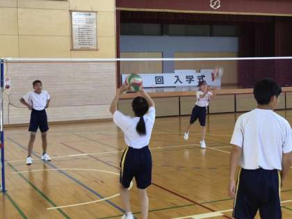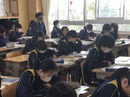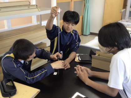 11日(火)、1年生の社会の授業では、熱帯地域の人々の暮らしの学習を行っていました。衣食住について各自が教科書等で調べたことをクラス全体で共有していました。発言に意欲的で多くの意見が出されていました。2年生の体育の授業では、バレーボールの授業を行っていました。ネットを挟んでのトスの練習を行っていました。ペースよく練習を進めながらも、バレー部の生徒等の上手な生徒が経験の浅い仲間に的確にアドバイスをしていました。3年生の理科の学習ではエネルギーの学習を行っていました。高さやおもりの質量の違いによる位置エネルギーの大きさについて、協力して実験に取り組んでいました。結果の読み取りに正確性が求められるため、小さな目盛を丁寧に読み取っていました。