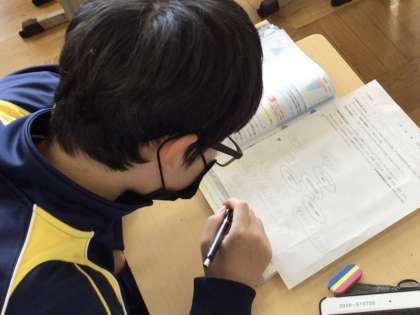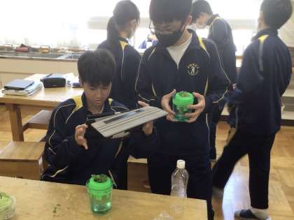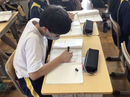 12日(水)、1年生の数学の授業では、素因数分解の学習を行っていました。これまでの学習の発展的な課題を解く内容で、2つの解き方のコツを確認した後で、各自集中して問題演習に取り組んでいました。2年生の技術の授業では、栽培の学習を行っていました。授業の始めに各自で育てている水耕栽培の世話を行っていました。栽培開始から1ヶ月近く経ち、随分と大きく成長していました。成長の様子をタブレットで撮影しながら、自分のものが無事に育っているのを嬉しそうに観察していました。3年生の社会の授業では、公民の学習を行っていました。持続可能な社会について考えることをテーマに、まずは各自でウェビングマップという手法を用いて、持続可能な社会に必要なキーワード等のつながりをワークシートに書き出していました。多くのものを書き出している生徒が多く、深く考えて作業をしている様子が伺えました。