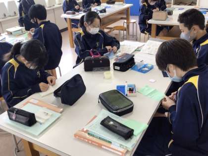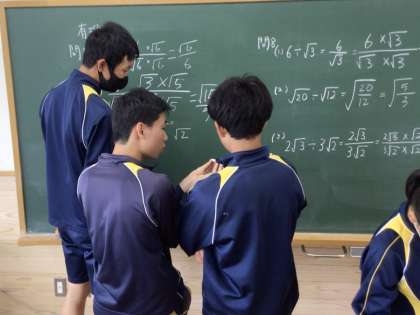 13日(木)、1年生の家庭の授業では、衣服の学習を行っていました。裁縫の実習として、基本的な縫い方を学習してきたことを生かして、玉結びと玉止めのテストを行っていました。直前までやり方を復習しながら集中して取り組んでいました。2年生の理科の授業では、化学変化の学習を行っていました。今回は、かいろの原理について学び、発熱の様子を確かめていました。身近な材料で高熱を発することに驚いていました。3年生の数学の授業では、平方根の学習を行っていました。有理化の計算に取り組んでいましたが苦戦している生徒が多く、仲間とじっくりと話し合いながら取り組んだり、先生に丁寧に教えてもらったりしながら、理解できた時にはうれしそうにしていました。