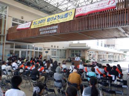 15日(土)交流館エントランスにて、社会を明るくする運動が行われました。地域の方がそれぞれの立場において力を合わせ、犯罪のない地域社会を築く運動です。本校からは、ボランティア部が運営に携わり、代表生徒による作文発表や吹奏楽部による演奏披露を行いました。