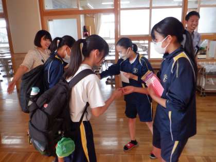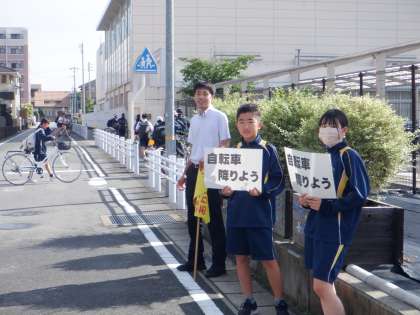 気持ちの良いあいさつをしてくれた生徒へシールを手渡したり、学校西門近くの交差点では、自転車を降りて渡ることを呼び掛けたりしています。