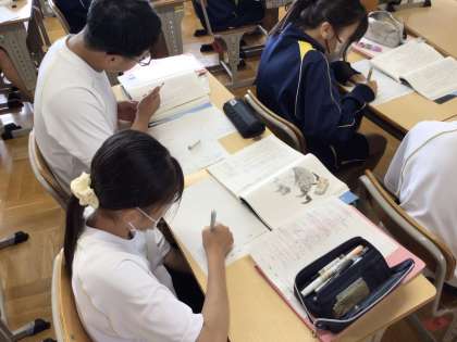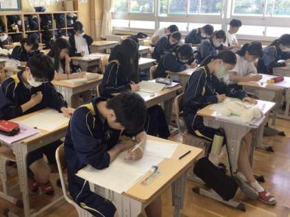 4日(木)、1年生の国語の授業では、読み物の読解の学習を行っていました。教科書の本文を各自で読みながら、登場人物の心情を読み解いていました。ここまで各自の読み取り、グループや学級全体での話合いを繰り返しているため、様々な記述から細かく読み取っている生徒が多く、感心して見させてもらいました。2年生の体育の授業では水泳の学習を行っていました。レベルに応じてクロールの練習を行っており、どのコースも意欲的に練習に取り組んでいました。コロナで水泳の機会が少なかったことで泳ぎに自信がなかった生徒が多かったようですが、初歩的な活動から慣らしながら練習を重ねて随分と上達した生徒が多いようです。3年生の英語の授業では、長文問題の演習に取り組んでいました。次週行われる学習診断テストに向けて、各自で取り組んだ後、全体で確認しながら解説を聞いていました。