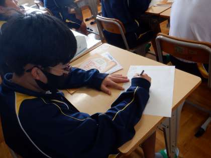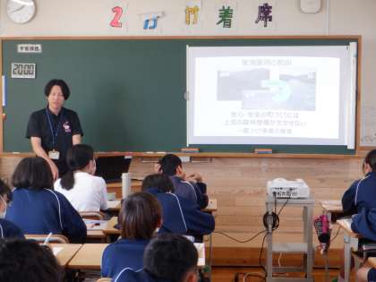 本日1年の学級に、豊田市役所防災対策課の方に来ていただき、水害を防ぐためには森林整備が必要であることや、水害以外で浄水中でも起こる災害としては、地震災害があることについて教えていただきました。