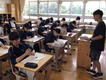 9日(火)、1年生の英語の授業では、単元テストの復習や見直しを行っていました。個別に聞いてみると、自分の誤答について原因を振り返って次にどうすべきかを説明してくれました。友達や先生に質問する姿も見られ、次につながる時間になっているようでした。2年生の体育の授業では、水泳の学習を行っていました。習熟度別にビート板を使ってバタ足の練習を中心に行っていました。リーダーの生徒が指示やアドバイスをしたりしながらまとまりよく活動に取り組んでいました。3年生の数学の授業では、実力テスト対策として問題演習に取り組んでいました。先生の解説を聞きながら、集中して見直しをしていました。