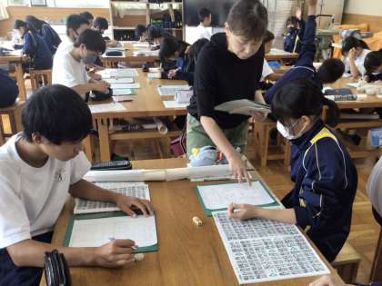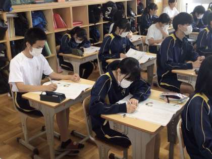 17日(水)、1年生の美術の授業では、レタリングの学習を行っていました。個々に選んで描いてきた文字について、先生からアドバイスをもらい、完成した人からトレーシングペーパーへの転写作業に入っていました。先生の合格をもらった子から喜びの声が上がったり、途中の段階の子からは頑張らなきゃ、と気合いの入った一言が聞こえてたりして、それぞれが自分の課題に向き合いながら作業に取り組んでいました。2年生の英語の授業では、異国文化の学習を行っていました。ALTが全て英語で、日本とアメリカの文化の違いを紹介し、特に学校について取り上げていました。時折クイズを織り交ぜながら楽しく学んだり、驚きの声を上げたりしながら文化の違いについて理解を深めていました。3年生の道徳の授業では、情報モラルについて学んでいました。ネット情報の正しい扱い方や相手のことを考えた対応について、クラスで意見交流等を行いながら、一人一人がしっかりと考えていました。
