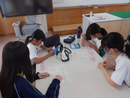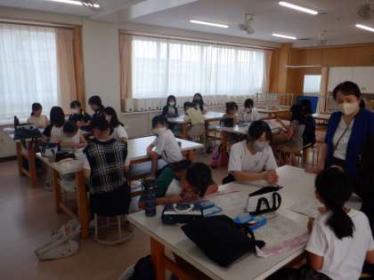 小学生がシュシュ作りに挑戦しています。中学生が作業について丁寧に教えたり、気軽におしゃべりしたりして、リラックスした雰囲気を作っていました。「ここを〜して」「上手に縫えているよ」と優しく声掛けをしてくれ、小学生も楽しんで活動できていました。