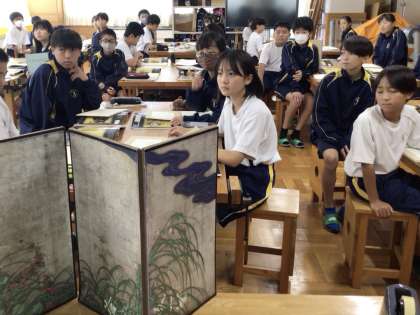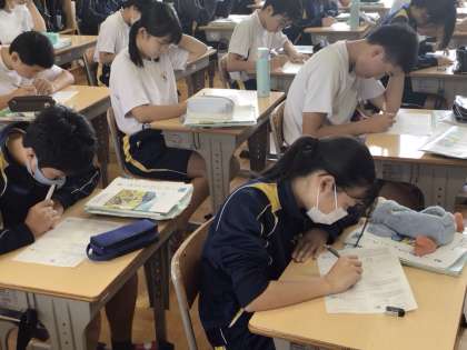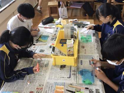 4日(水)、1年生の美術の授業では、日本の古典作品の鑑賞を行っていました。国宝の風神雷神図屏風や鳥獣人物戯画について、資料集の写真や先生が美術館で購入してきたレプリカを見ながら作品を味わっていました。レプリカが登場した時には歓声も上がって興味津々でした。2年生の美術の授業では、マーブリングという技法を使った作品作りに取り組んでいました。水面に絵の具の色を浮かべ、流れを作ったり、道具で模様を作り出したり、偶然にできる模様を画用紙に転写していました。3年生の国語の授業では、文法の学習を行っていました。今回は品詞の分類について、様々な種類を確認しながら整理していました。ワークシートに大切な部分をマーカーで色付けするなど、先生の説明を聞きながら熱心にまとめていました。