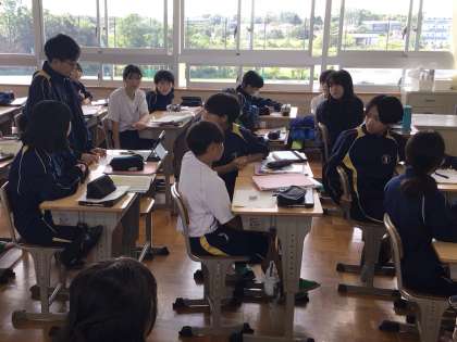 どの授業でも生徒の皆さんが一生懸命に課題に取り組んで考えたり、仲間と協力して活動したり生き生きと取り組んでいる場面が多く見られ、教育委員会の方からもお褒めの言葉をいただきました。これからも評価していただいたことを続けて生徒の皆さんの成長に繋げていきたいと思います。