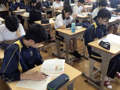 20日(金)、1年生の理科の授業では、光の性質の学習を行っていました。単元の導入ということもあり、水を入れたフラスコに1円玉硬貨を入れたらどのように見えるかという不思議な現象に触れていました。単元の最後には謎を解明できると良いと思います。2年生の体育の授業では、バレーボールの学習を行っていました。サーブの練習を行う中で、コミュニケーション力向上も目標にして、直接動作で示したり、タブレットのカメラ機能で撮影した動画を再生しながら説明したりしていました。3年生の道徳の授業では、資料をもとに自制する心について学んでいました。自由や一人で過ごす影響を話し合い、資料の作者の考えに触れながら「独りを慎む」とは何かをみんなで考えていました。