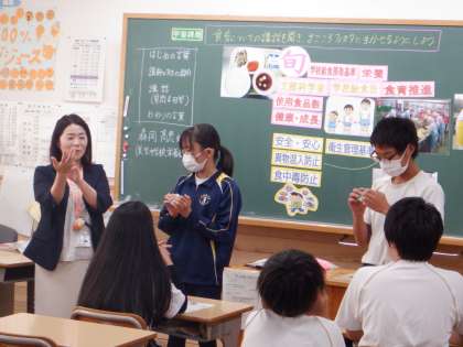 30日(月)東部給食センターの栄養教諭を講師に迎え、2年生の教室で給食や食の安全など、食育について学びました。