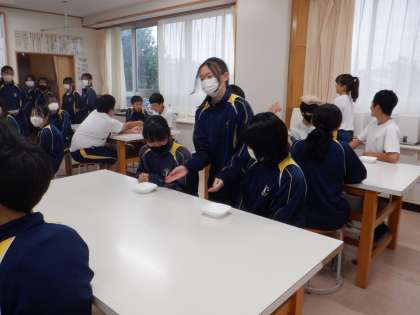 生徒たちは、実際にお皿のふちを持ちながら、お互いに料理を提供する練習をしました。本番までに家で食器を運ぶ、さげる、など自分でできることを練習し、本番成功できるとよいですね。