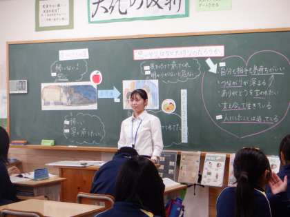 黒板への掲示物や板書の仕方について、しっかりと準備をし、生徒たちに分かりやすく伝える工夫がたくさんありました。実習生のがんばりにこたえようと生徒たちも活発な発表や思考が見られました。