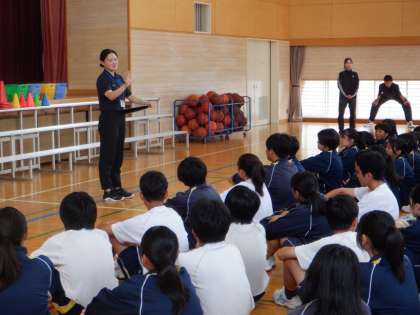 「バウンドを低くした方がよい」「顔をあげて周りを見るとよい」などの意見が出てきて、その動きを意識したドリブル練習やゲームを行いました。
