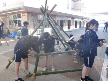 3年生では、竹を使ったジャングルジムを製作しています。実際に人が乗れる立派な遊具で、生徒たちも乗りながら耐久性を確かめています。重量制限は60Kgだそうです。