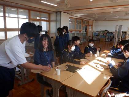 2年生のレストランを開催するクラスでは、教員をお客さんに見立て、接客の練習中。「後ろから失礼します」「ありがとうございました」など、丁寧な言葉がけを心がけて練習していました。レストランの予約は満員御礼だそうで、皆さんが楽しみにしてくださっています。