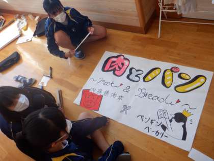 串カツバーガーを販売する2年生の教室では、お店に掲示するポスターを作成していました。お客さんの目に留まるようにしながらおいしさが伝わるようなポスターを、仲間と協力して作成しています。