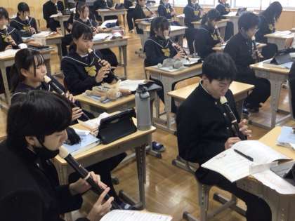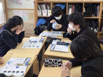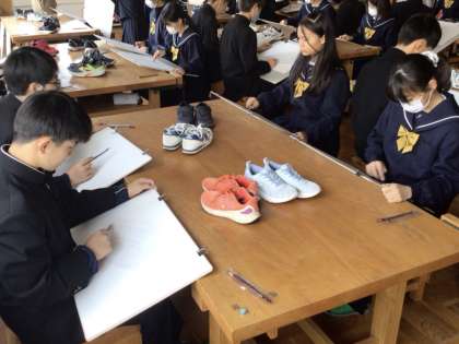 27日(水)、1年生の美術の授業では、デッサンの学習を行っていました。今回のモチーフは靴。鉛筆の扱い方や描き方、鉛筆の削り方を一つ一つ教えてもらいながら、集中して描いていました。モチーフである見慣れた靴を改めてじっくり観察したり、鉛筆や手で大きさを測ったりしながら少しずつ仕上げていました。2年生の音楽の授業では、アルトリコーダーの学習を行っていました。今日の課題曲は「聖者の行進」。リズミカルで軽快な曲のイメージを表現できるように一生懸命に練習していました。「難しい!」と言いながらも粘り強く取り組んでいる姿が立派でした。3年生の理科の授業では、天体の学習を行っていました。天体を扱う上で大切な方位の見方について、しっかりと身に付けられるようにと、ミニ地球儀を用いて一人一人が地球上の様々な地点における方位を確認していました。