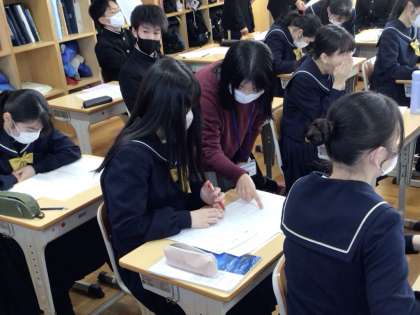 4日(水)、1年生の英語の授業では、want to を使った表現を学習していました。今回は自分が行ってみたい海外について各自でプレゼン資料を作って、それを提示しながら英語でスピーチしていました。様々な国や地域の話題が出て、楽しみながら発表を聞き合っていました。2年生の英語の授業では、比較級や最上級の学習を行っていました。一人一人が比較級や最上級を使ったクイズを考え、それをみんなで問題を解き合っていました。内容は身近な話題から他教科の内容まで様々で、多くの英文に触れて基本の定着を図り、楽しみながら学んでいました。3年生の英語の授業では、入試対策問題の復習を行っていました。模範解答の確認や先生の解説を聞いた後、仲間同士や先生に個別に教えてもらうなど、熱心に振り返っている様子が見られました。