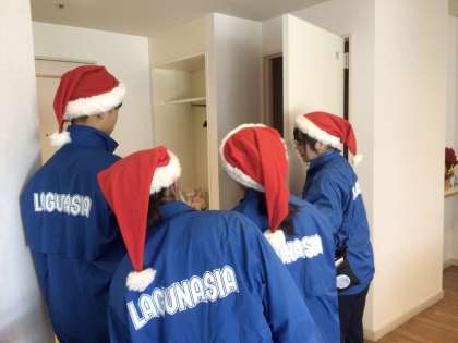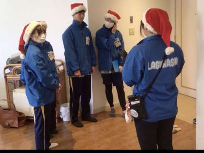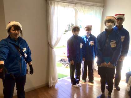 館内の清掃を体験しているチームです。青いユニフォームと季節に合わせてサンタの帽子を着用して作業を行っています。