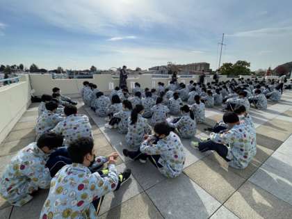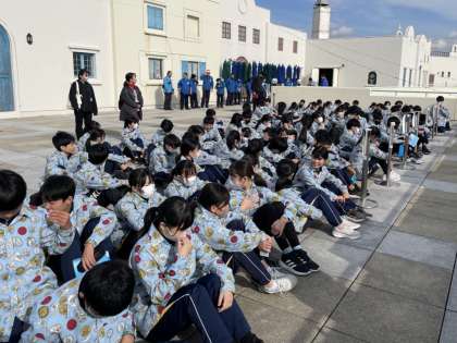 午後になり、前後半の活動が交代になります。午後に職場体験を行うチームは着替えをして事前指導を受けます。蒲郡付近は天気に恵まれていい風景になっています。