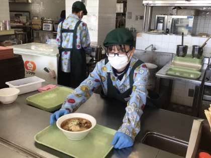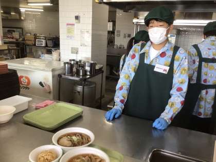 ラーメン屋さんで体験しているチームです。生徒が作ったラーメンセットはおいしかったそうです。また、元気で爽やかな態度で接客できていました。