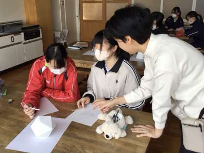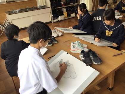 18日(水)、1年生の美術の授業では、デッサンの学習を行っていました。モチーフとして自分の靴を描いていて、作業もかなり進んでいるため、鉛筆による書き込みもかなり多くなっていました。大きめの用紙にいっぱいに描かれた靴は立体感や迫力があって見応えがある作品ばかりでした。2年生の美術の授業でも、デッサンの学習を行っていました。陰影を強調した立体感のある描き方を実習するため、照明を止めて自然光だけでモチーフを観察して作業に取り組んでいました。先生から助言をもらい、視点なども工夫しながら描いていました。3年生の数学の授業では、三平方の定理の学習を行っていました。定理を活用するための様々な演習に取り組み、黒板に代表生徒の考えを表しながら、仲間同士や全体で話し合って理解を深めていました。